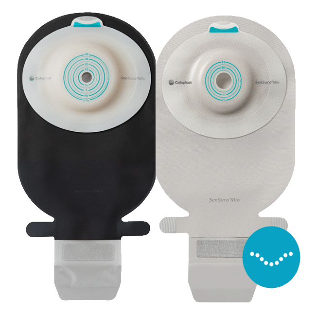 - SenSura Mio Convex har en tilpasningsvenlig convexskål og en elastisk klæber, som giver en sikker vedhæftning* selv til ujævne hudområder, dybtliggende områder og stomier, som skal have hjælp til at blive skubbet frem.